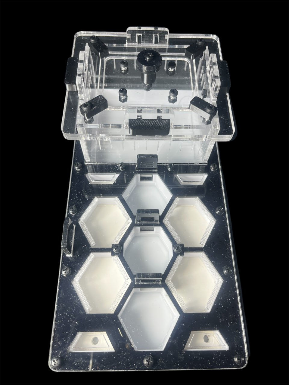 Многие производители используют литой акрил из-за его дешевизны, но он имеет «разнотал» — толщина листа может варьироваться на 0.5 мм. В профессиональной ферме размером 200х200 это недопустимо. Мы применяем только немецкий экструзионный акрил. Он обладает идеальной плоскостностью. Благодаря этому, при стяжке нейлоновыми винтами, слои прилегают друг к другу с допуском менее 0.05 мм. Это гарантирует, что даже микроскопические рабочие Crematogaster biroi не окажутся зажатыми между слоями.