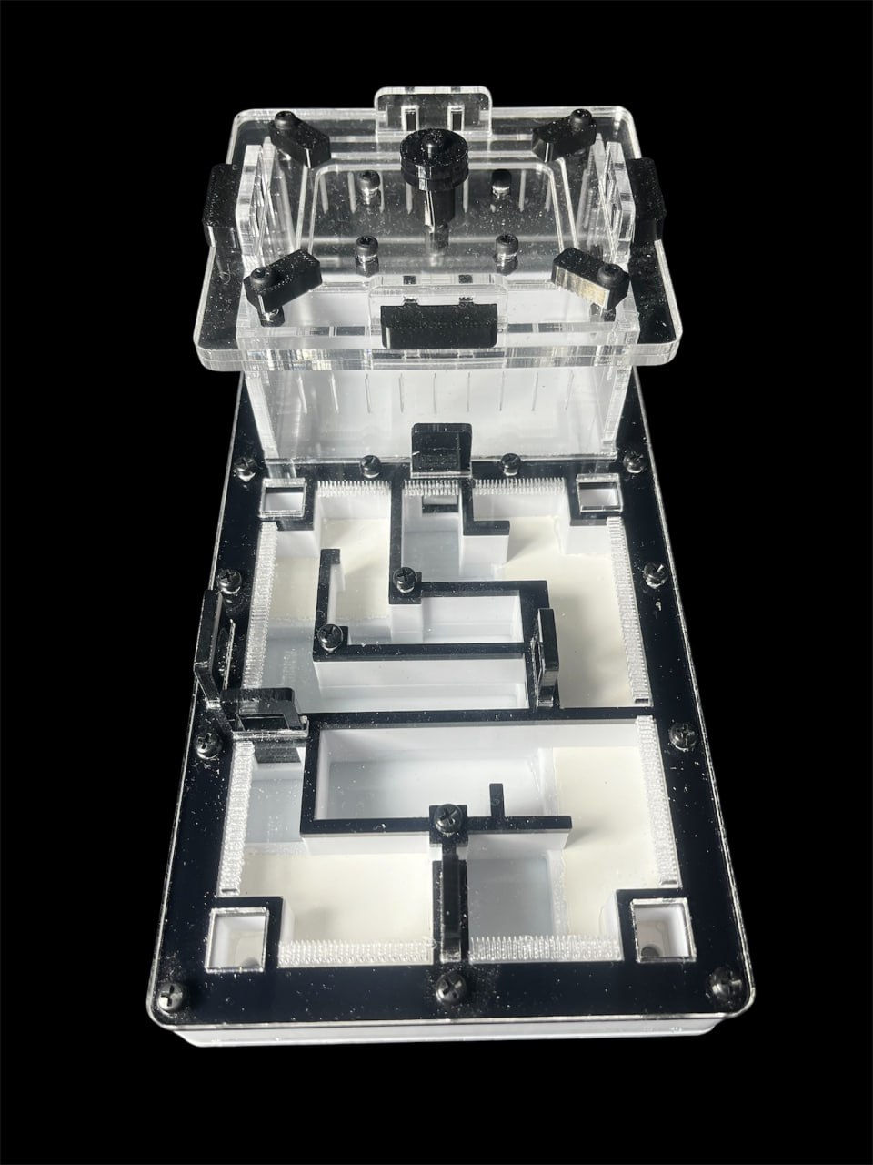 Премиальная сборка и химическая безопасность Корпус фермы собран из многослойного акрила (желтый, белый, прозрачный) толщиной 3 мм и PETG-пластика. Мы принципиально используем белый нейлоновый крепеж во всех муравьиных фермах серии 220х110 Варианта Б. В условиях постоянной высокой влажности металлические болты неизбежно окисляются, выделяя токсичные оксиды. Нейлон же абсолютно инертен к воде и муравьиной кислоте. Это гарантирует, что внутри всех частично гипсовых муравьиных ферм (и моделей со сплошным гипсом) среда остается биологически чистой десятилетиями.